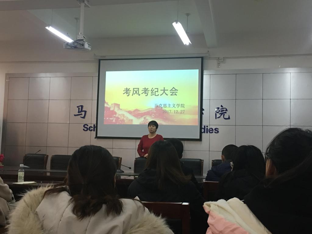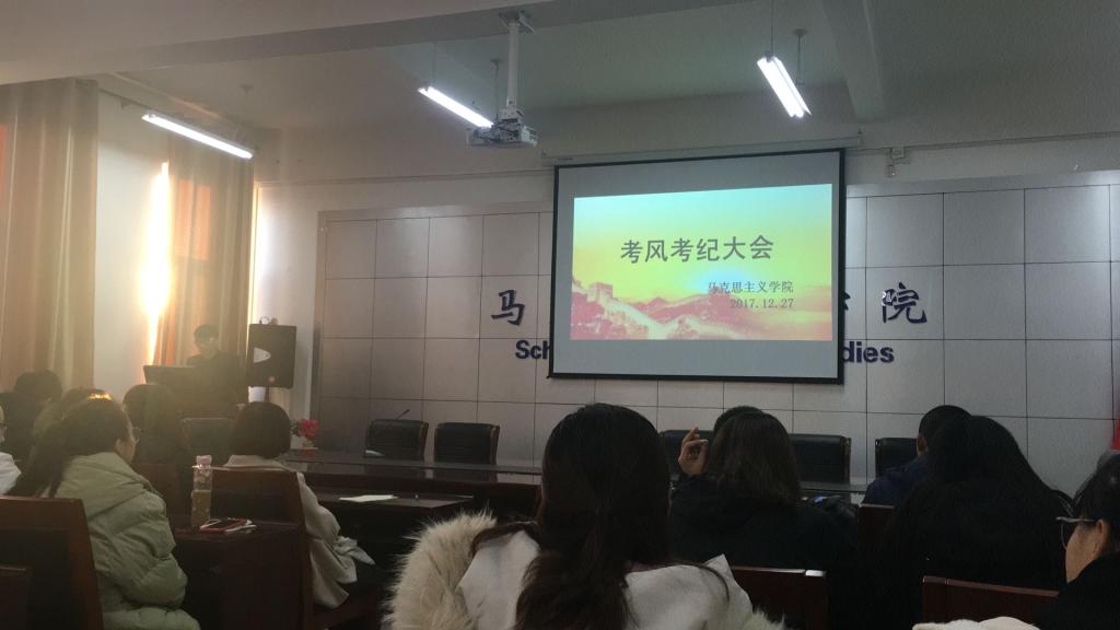 2017年12月27日下午,我院在腾飞楼C517举行本学期考风考纪教育大会,本次教育大会的主题是“微笑迎考,真诚应考”,学工办老师及我院大一年级全体同学参加了此次教育大会。