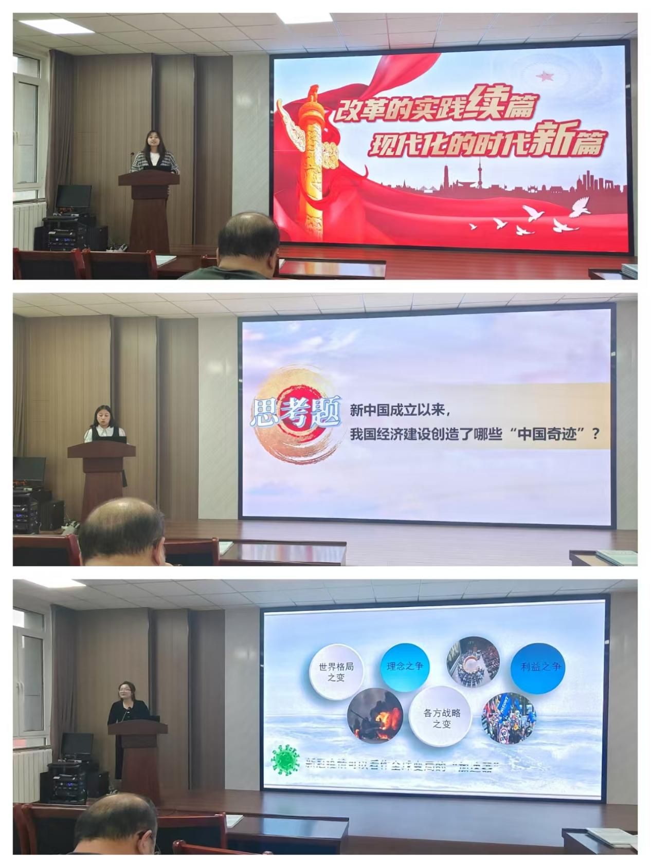 张婧、王敏、郝志芳三位老师分别就《改革的实践续篇 现代化的时代新篇》《七十五载迎盛世 砥砺前行续华章》以及《推动构建新时代的大国关系格局》等专题进行教学展示,与会教师围绕本学期四个教学专题的重难点突破等相关问题进行交流研讨。