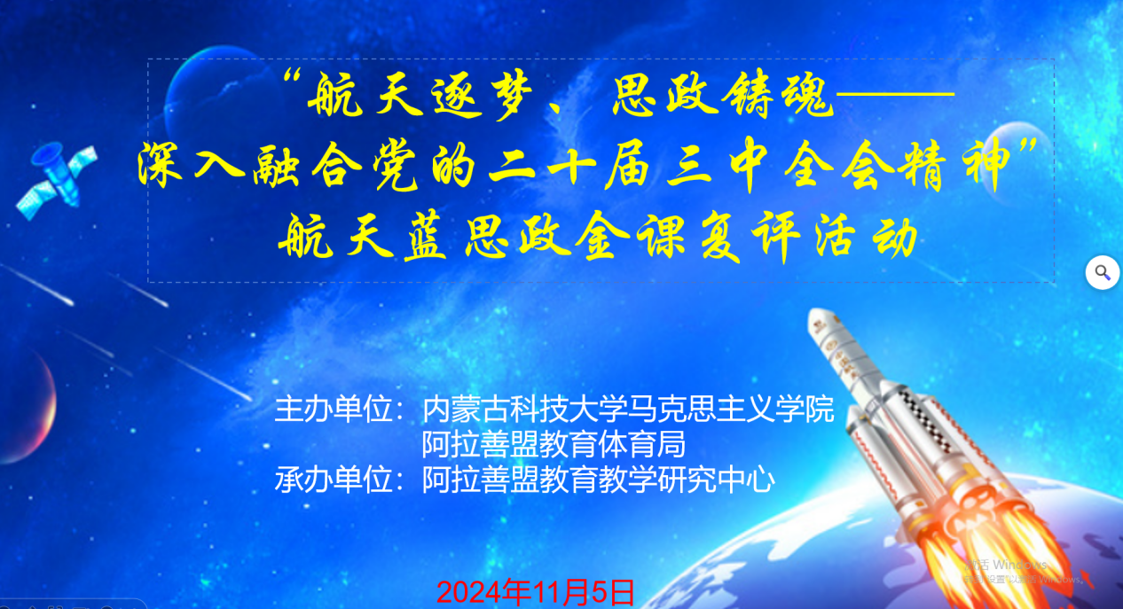 为深入学习贯彻习近平总书记关于新时代学校思政课建设的重要指示精神,进一步推进大中小学思政课一体化建设,将党的二十届三中全会精神深入融入思政课教学,实现党的创新理论与思政教育同步,11月5日,我院与阿拉善盟教育体育局共同举办”航天逐梦、思政铸魂——深入融合党的二十届三中全会精神”航天蓝金课复评活动。我校德育中心主任、学院副院长金海斌、思想道德与法治教研室晋楠老师参加此次活动。