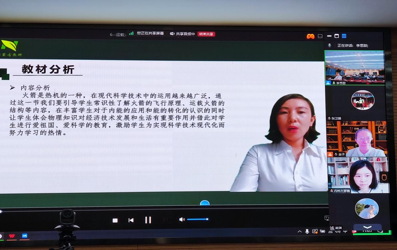 第三部分由金海斌老师做总结发言。她指出,此次活动选择在神州十九号成功飞天、神州十八号顺利返航的重要时间节点,选择这一时机进行“航天蓝”主题思政金课建设正逢其时。感谢阿拉善盟教体局在组织“航天蓝”思政金课建设方面做所的努力,并就如何加强双方进一步开展大中小学思政课一体化建设、实现资源共享,共同打造思政金课,提升思政课程的建设水平,形成带有地域特色又彰显家国情怀的思政金课提出一些意见和建议。阿拉善盟教育体育局思政教研中心李思甜在总结发言中表示,希望今后双方进一步加强沟通,在课程资源开发、集体备课、“大思政课”建设等方面通力合作,共同开拓思政课建设的新局面。