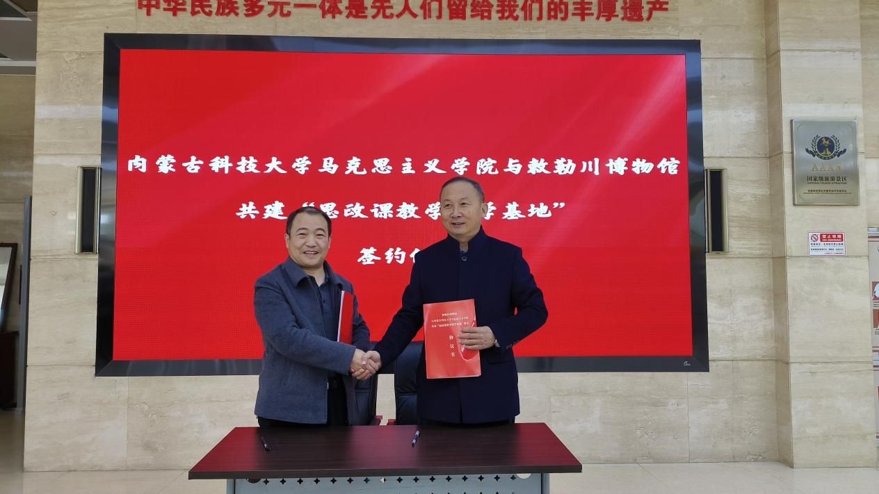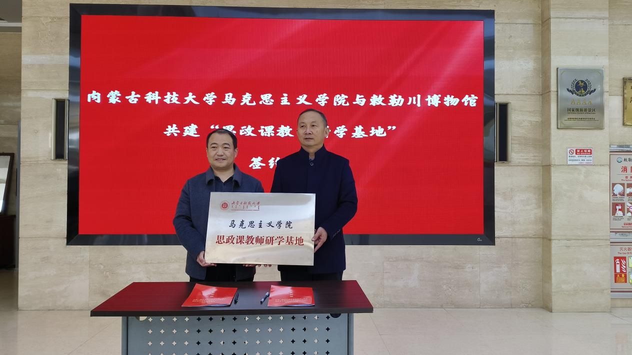 首先,yl6809永利官网集团副院长杨德桥与土右旗敕勒川博物馆馆长赵俊峰共同签署“思政课教师研学基地”共建协议,并举行授牌仪式。双方一致表示,yl6809永利官网集团在土右旗敕勒川博物馆设立“思政课教师研学基地”,通过一系列的合作共建举措,促进校地双向赋能、同频共振,力争在学习研究、实践教学、社会服务、精神传承、校馆合作等领域取得建设性的效果。