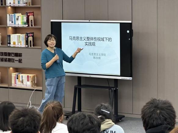 理论素养的提升离不开对原著的深耕。2025年10月23日下午,教研室组织师生在图书馆“石榴籽”阅读室开展了马克思主义经典著作阅读分享会。陈改桃老师以《马克思主义实践观》为主题进行了专题导学,师生们随后围坐一堂,共同研读《共产党宣言》、《实践论》、等经典篇目,围绕其中的核心内容及其时代价值展开热烈讨论。老师们精心引导,同学们踊跃发言,在思想的碰撞与交融中深化了对马克思主义立场、观点、方法的理解,提升了运用理论分析和解决问题的能力。
