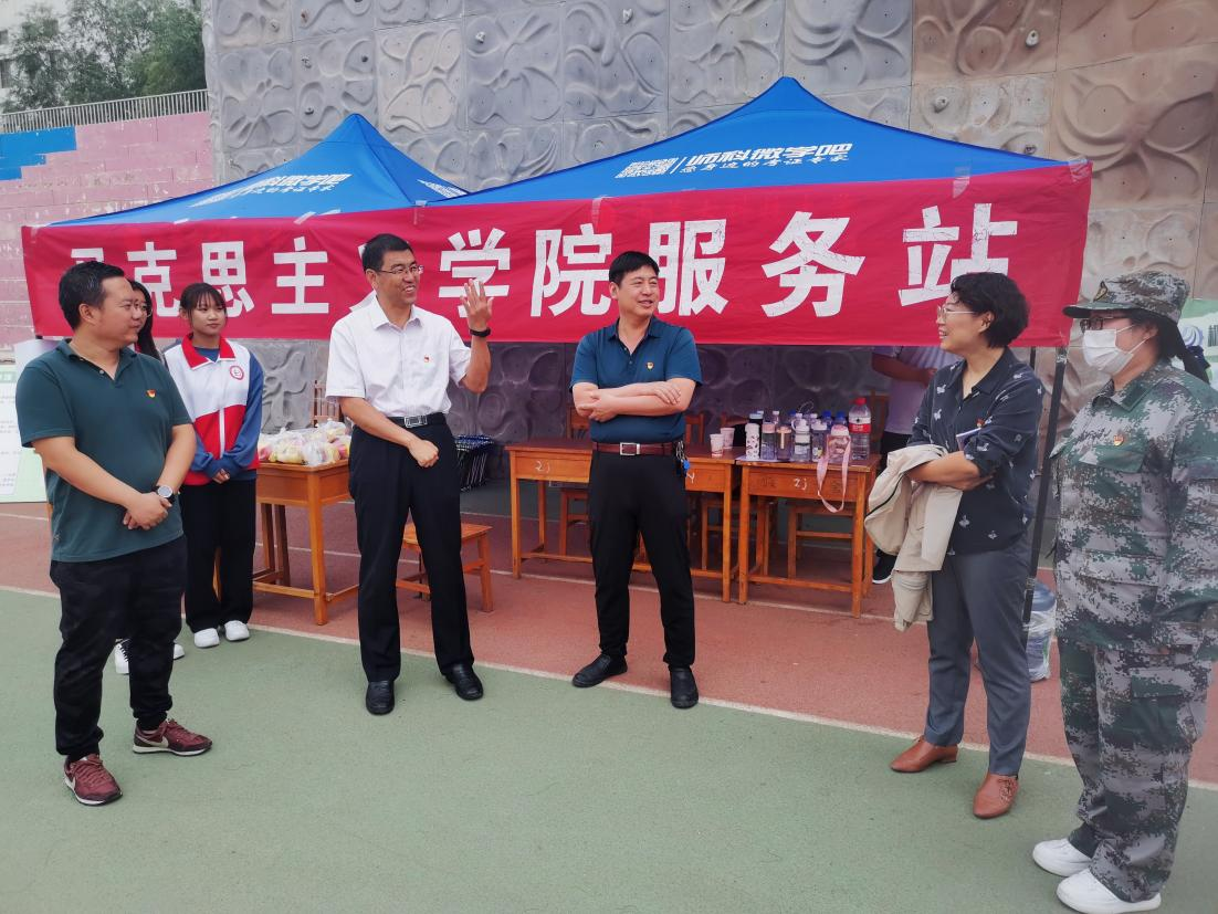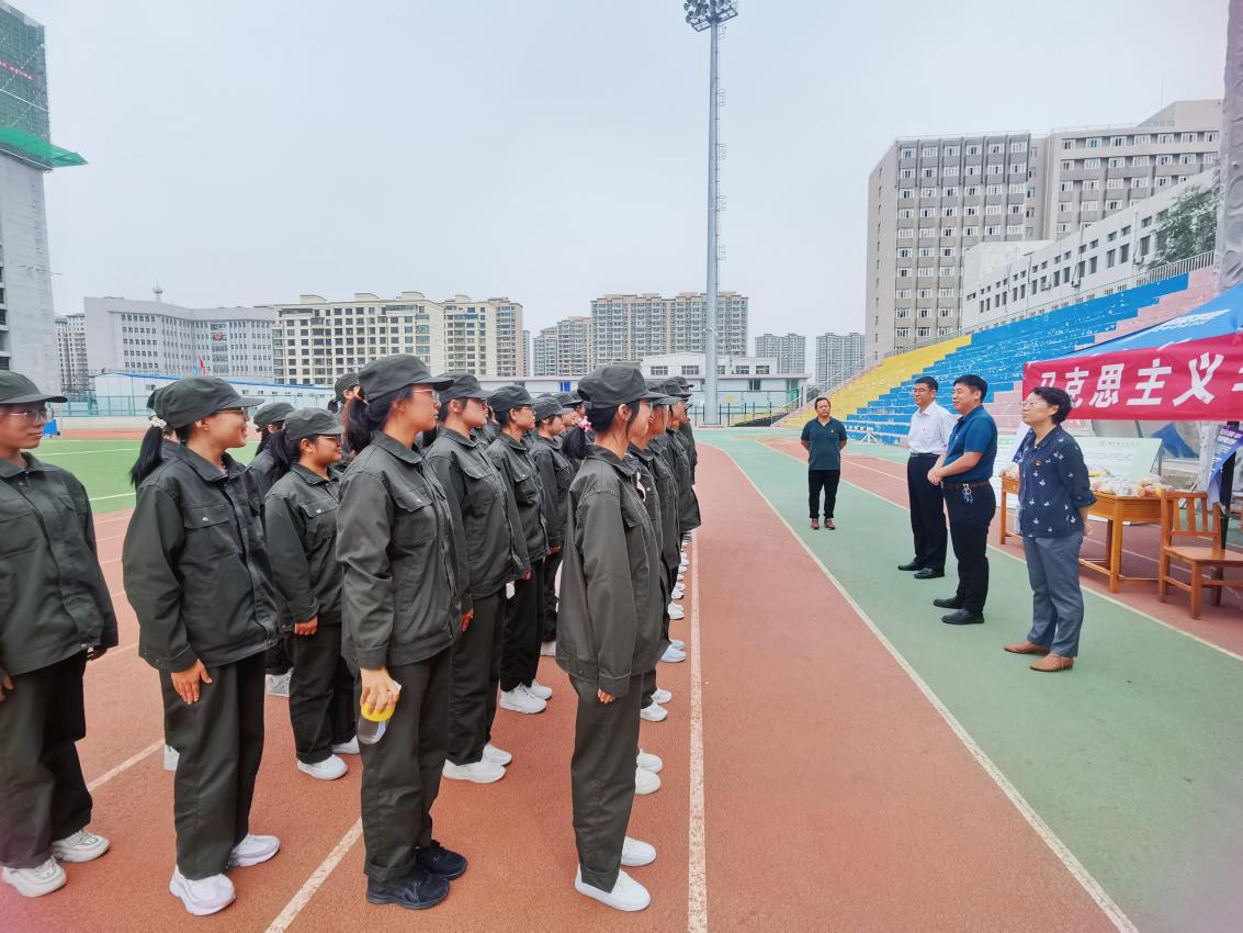 2021年9月18日上午,yl6809永利官网集团党总支书记马广辉,院长张光存,党总支副书记、副院长柴艳莎,综合办主任范炜,辅导员王海朋来到军训营地,看望我院2021级学生及随训教师王姗姗。