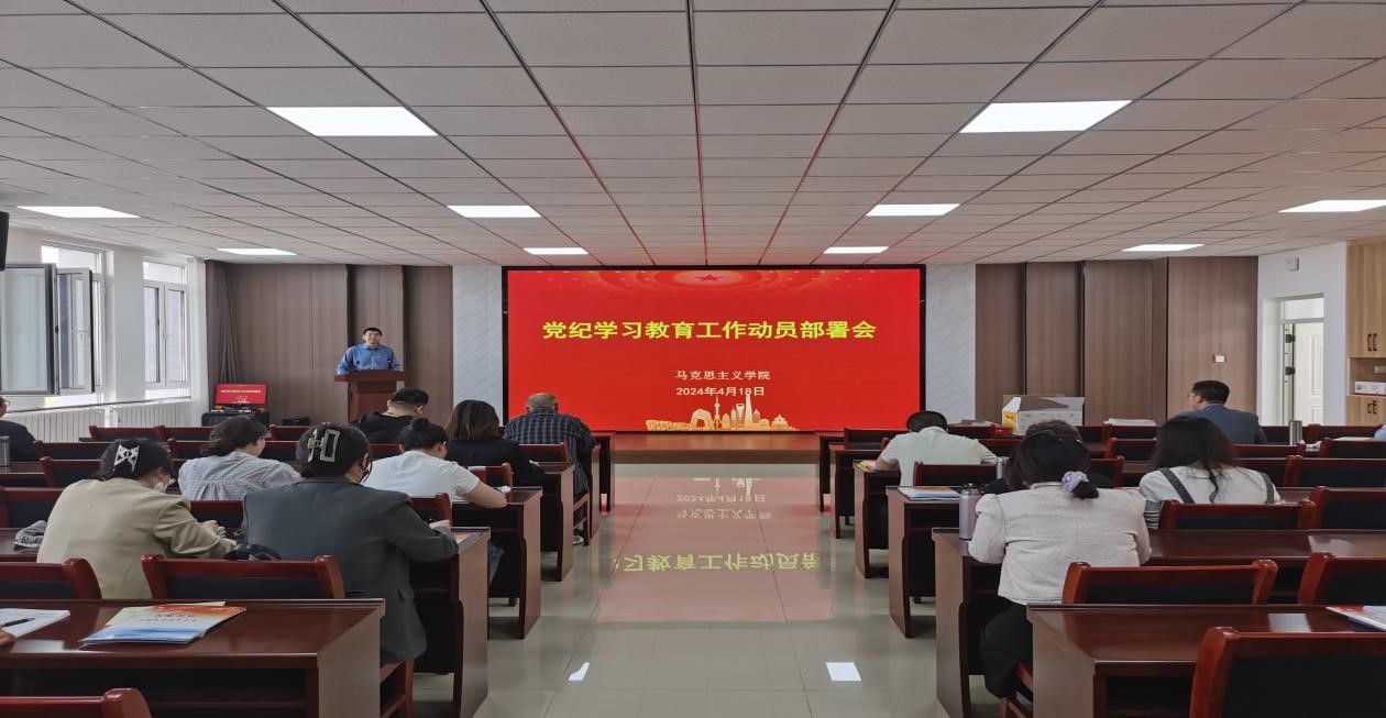 为全面落实《中共中央办公厅关于在全党开展党纪学习教育的通知》要求,深入学习贯彻《中国共产党纪律处分条例》,扎实开展全院党纪学习教育,2024年4月18日下午,马克主义学院党委在秋实楼扩505会议室召开了党纪学习教育动员部署会,会议由院长张光存主持,学院全体党员参加了本次动员会。