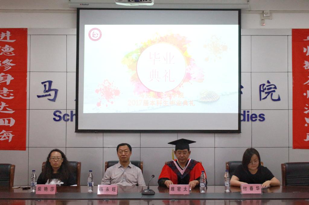 毕业典礼在雄壮的国歌声中拉开序幕,教授委员会委员、教师代表、毕业生代表、在校生代表分别进行了发言。发言结束后行拨穗礼,学院雎密太教授为毕业生拨冠正穗。同时,学院副书记为考取研究生的同学颁发纪念品,希望他们不忘初心,继续前进。接下来的宣誓环节由毕业生代表胡彦琪同学作为领誓人,带领全体毕业生庄严宣誓。最后毕业生向学院赠送礼物,大家合影留念,毕业典礼圆满落下帷幕。
