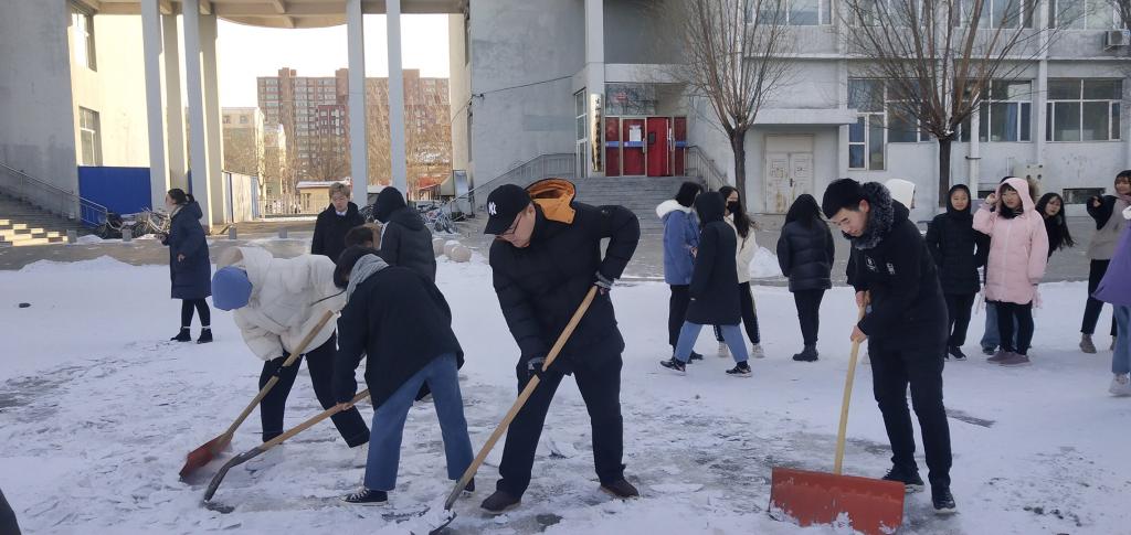 马院师生扫雪除冰的身影,为银装素裹的内科大增添了一道靓丽的风景线,给寒冷的冬日校园带来了不一样的温暖。