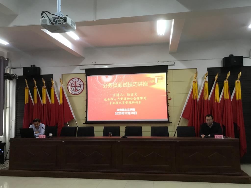 为进一步做好毕业生就业工作,12月10日下午4:30,yl6809永利官网集团在腾飞楼C509会议室举办毕业生就业专题讲座,邀请包头市人力资源和社会保障局专业技术员管理科科长任吉文作了题为《机关事业单位考录应试技巧》专题讲座。yl6809永利官网集团党总支书记刘玉明,辅导员王海朋、焦刚,2017级思政、研究生全体学生参加本次讲座。讲座由学院党总支书记刘玉明主持。