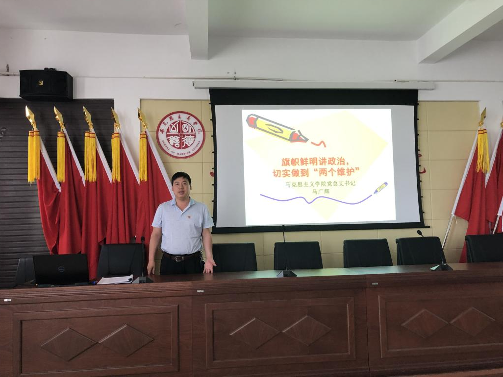 621日下午,党总支书记马广辉在腾飞楼C509会议室作了题为《旗帜鲜明讲政治,切实做到“两个维护”》的专题党课。全体党员聆听党课。