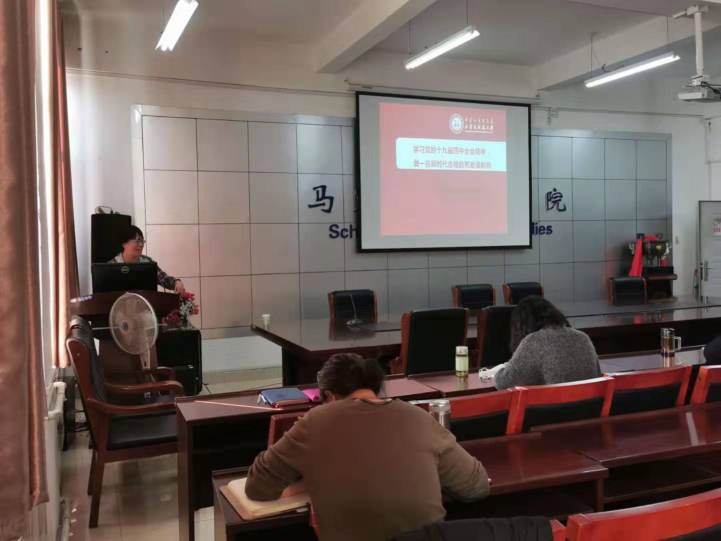 11月14日下午,教工党支部书记金海斌在腾飞楼C517会议室作了题为《学习党的十九届四中全会精神 做一名新时代合格的思政课教师》的专题党课。
